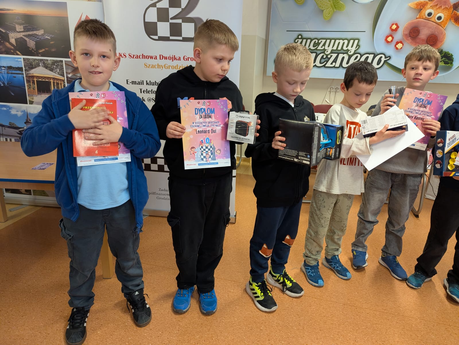 W weekend 11-12 kwietnia pojechaliśmy do Grodziska Mazowieckiego na turniej zorganizowany z okazji 10 rocznicy Klubu UKS Szachowa Dwójka. Bardzo lubimy tam jeździć, bo jest blisko, są grupy zróżnicowane poziomem i można zjeść pyszny tort.